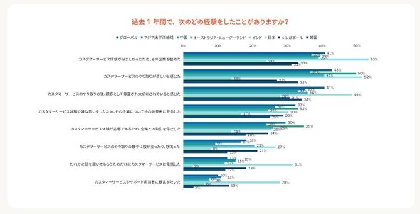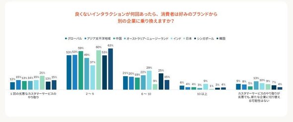 半数以上の消費者(グローバル、アジア太平洋地域それぞれ53%)が、顧客体験の良くないやりとりが2〜5回続くと、別の企業に乗り換えると回答した。一方、日本の消費者の21%は、「たった1回で乗り換える」と回答。これはサービスが良くなければ、ビジネスに即影響が生じる可能性があることを示唆している。