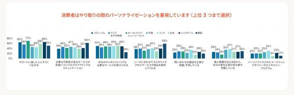 また、消費者はさまざまな形態のパーソナライゼーションを重視している。アジア太平洋地域の消費者は「問題解決できる人とすぐにつながること」(56%)を特に重視していた。以降は「必要なサービス、支援についてのプロアクティブなコミュニケーション」(46%)、「好みのチャネルでいつでも必要なサービスが受けられること」(45%)となった。