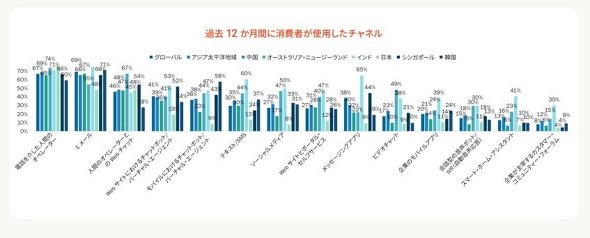 アジア太平洋地域の消費者が2024年に使用したチャネルとして最も多くあげたのは、「電話」(69%)と「Eメール」(66%)という結果に。アジア太平洋全体の消費者は、全世界と比較してデジタルチャネルでのやりとりを希望する傾向があり、「チャット」(48%)や、「チャットボット/バーチャルエージェント」(Webが39%、モバイルが38%)が上位に入った。