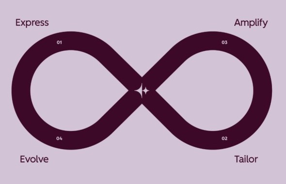 Loop Marketingは「EXPRESS」(表現)、「TAILOR」(個別化)、「AMPLIFY」(増幅)、「EVOLVE」(進化)の4つのステージで構成される。この4つのステージを常に行き来し、ぐるぐると回し続けることが重要だとする。